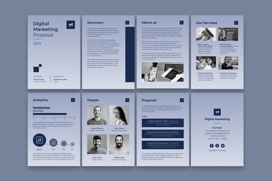 Nosso serviço de design de perfil de empresa é personalizado para transmitir efetivamente a essência da sua marca por meio de conteúdo visual atraente e redação persuasiva. De gráficos cativantes a narrativas envolventes, garantimos que cada aspecto do seu perfil represente com precisão sua empresa e suas ofertas.